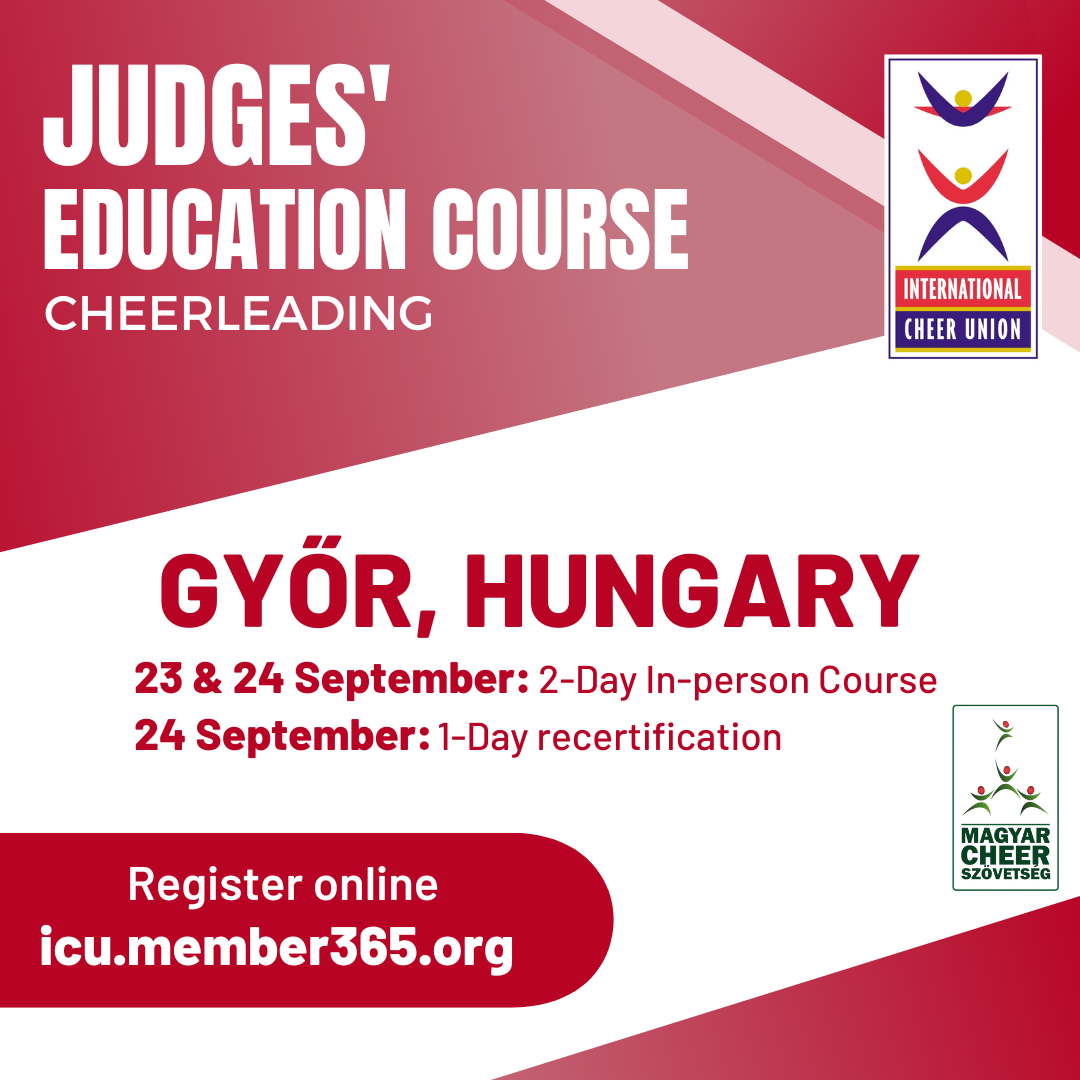 The Cheerleading Judges Education Course (JEC) is a two (2) day in person educational program that consists of interactive classroom and practical education. Upon completion of the comprehensive multiple choice test participants will receive a Phase 1 Certificate and Red ICU Pin. A video judging exam will be administered to those wishing to potentially receive Phase 2 by demonstrating their ability to score, rank and give adequate feedback. Phase 2 will be determined by evaluation of the exam results.